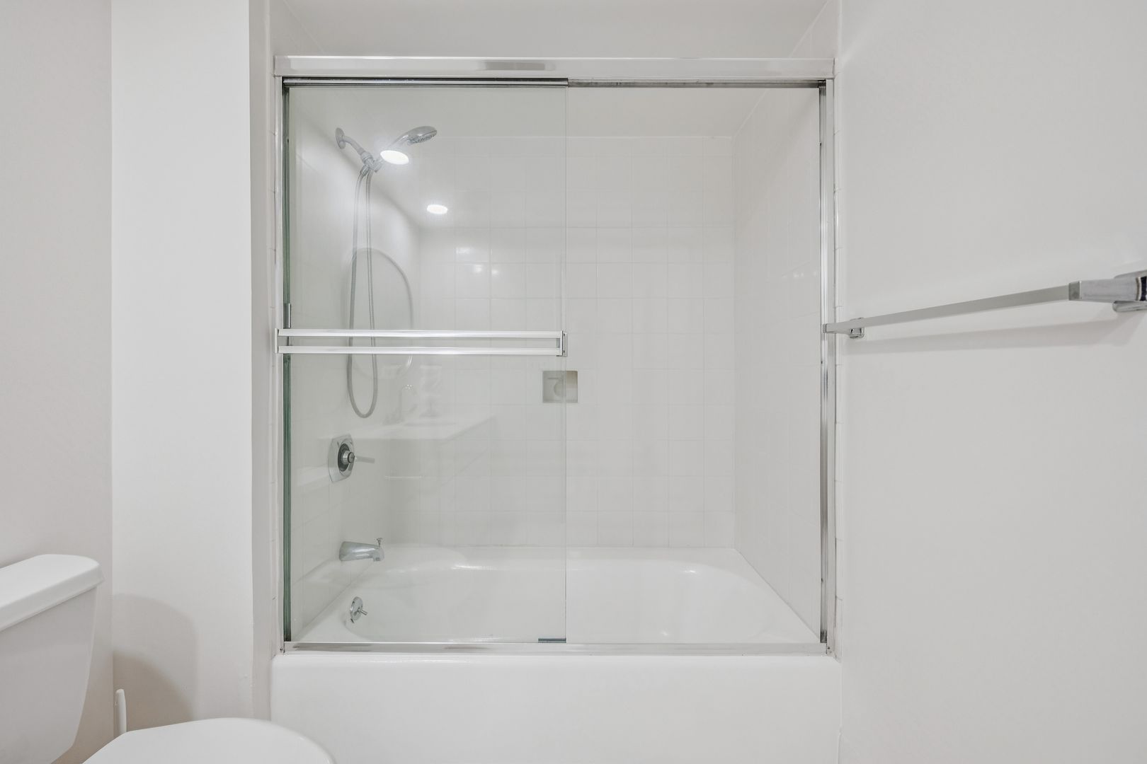 The spacious bathroom features a full tub, glass enclosure, and expansive vanity.