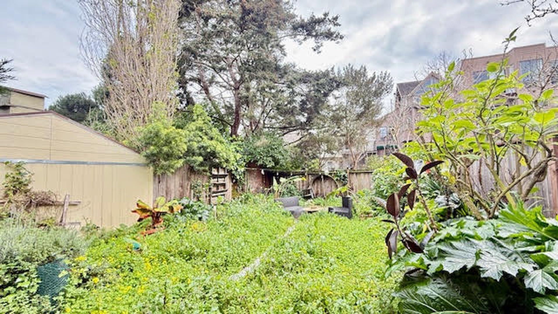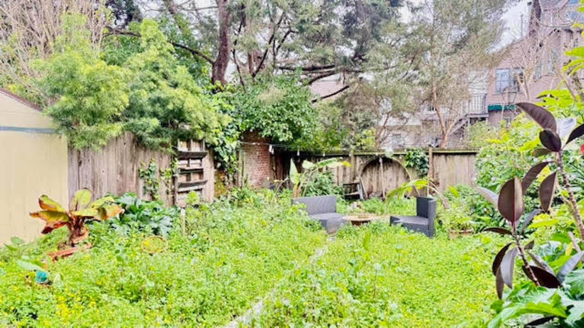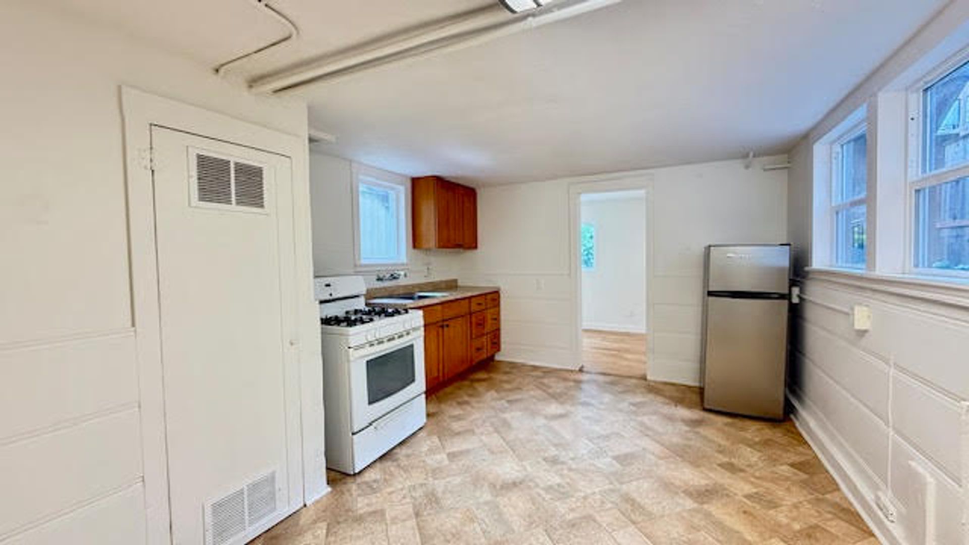 The home features a functional kitchen equipped with refrigerator, stove, and microwave. Enjoy a private, street-level entrance and direct access to the shared backyard.