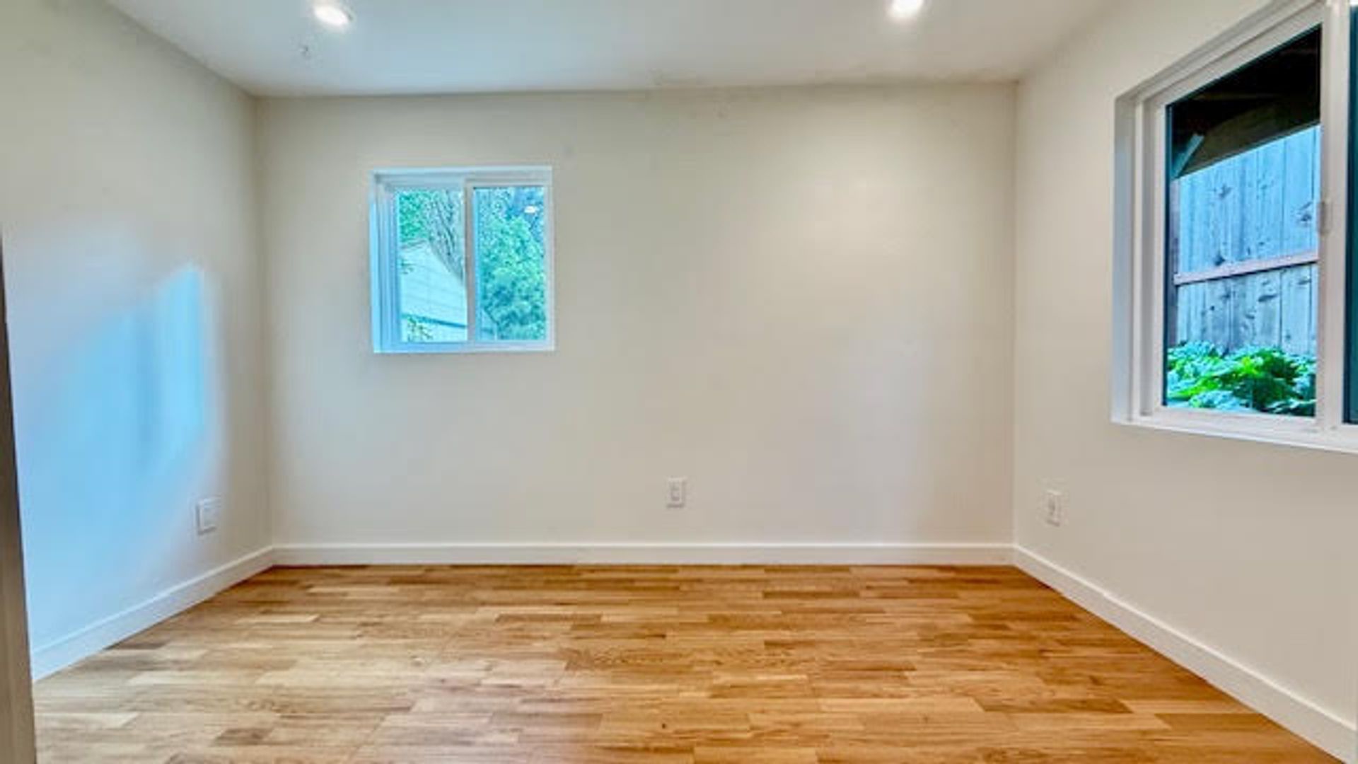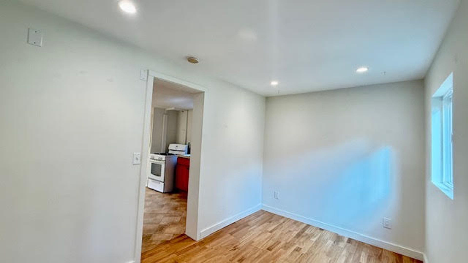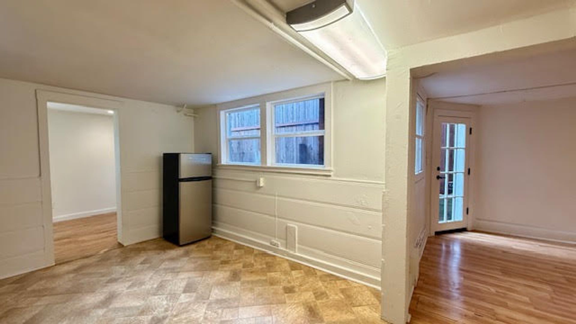 The home features a functional kitchen equipped with refrigerator, stove, and microwave. Enjoy a private, street-level entrance and direct access to the shared backyard.