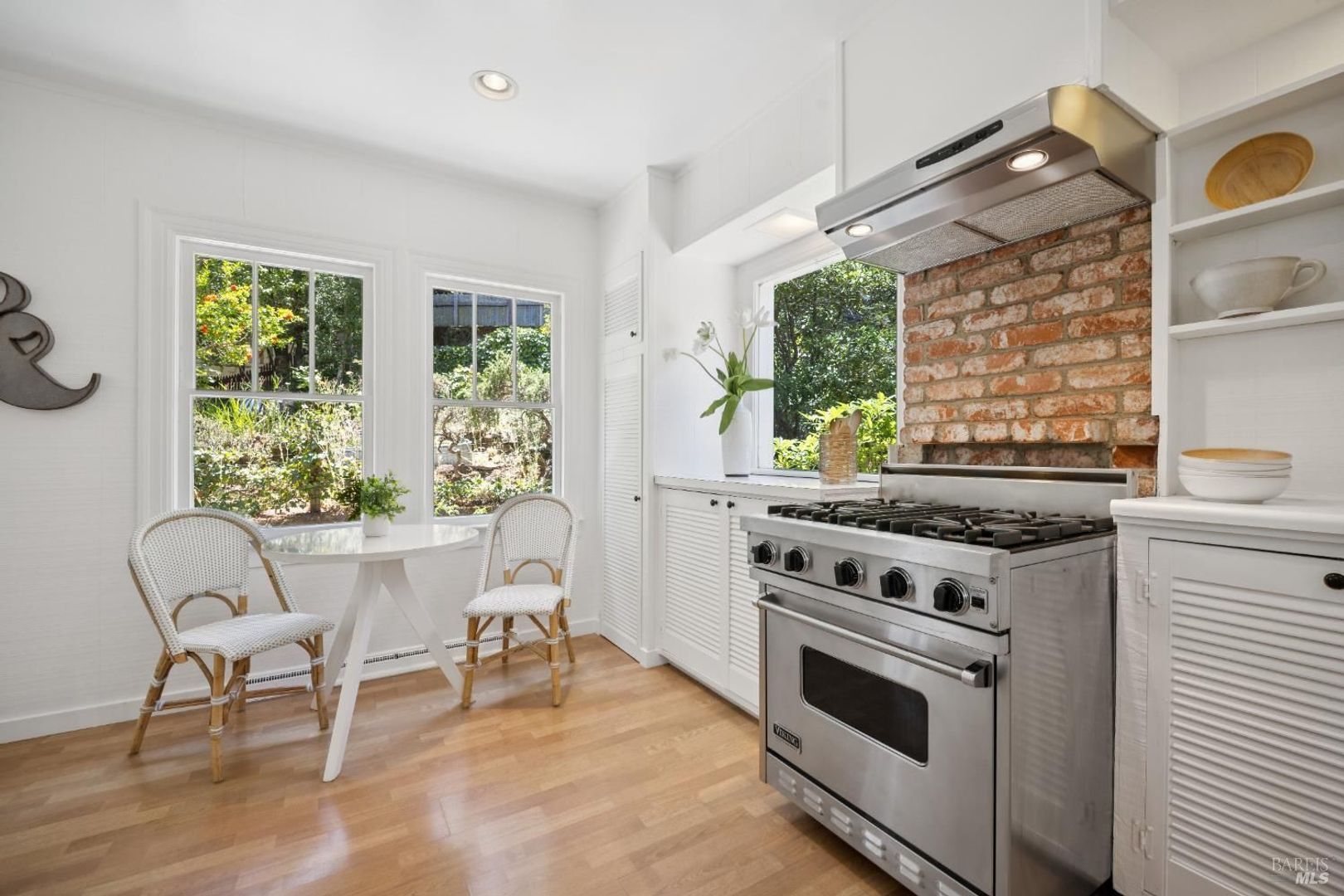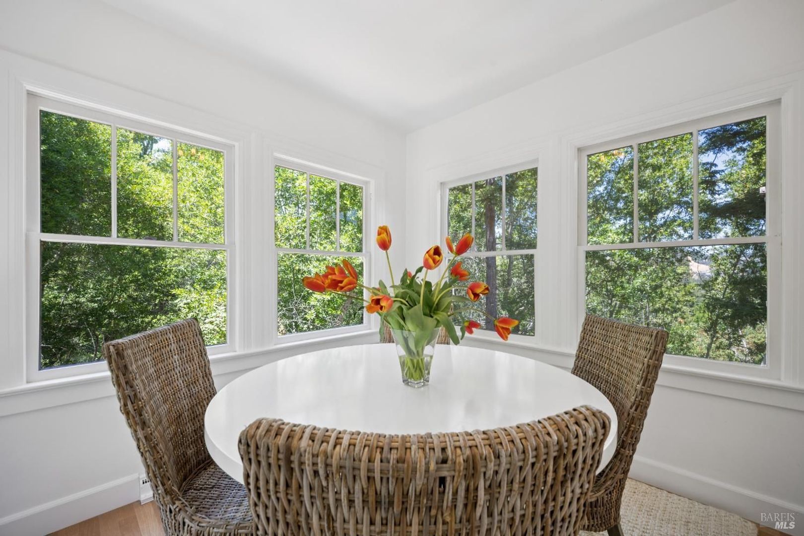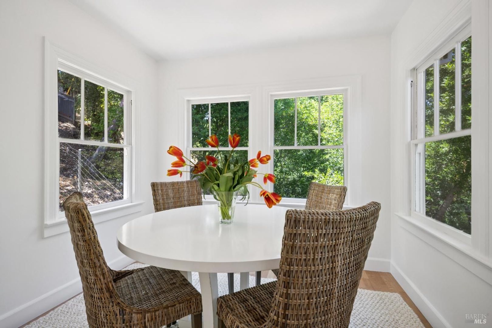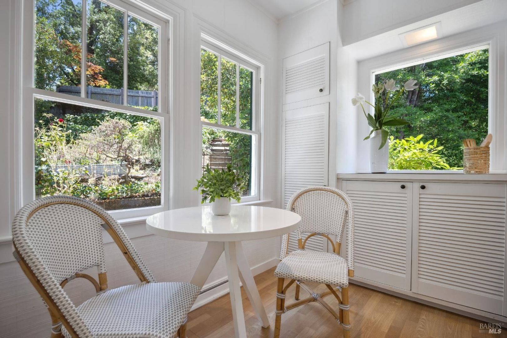 The living room has a wood-burning fireplace which is surrounded with large windows that provide plenty of light. The kitchen is very spacious with an abundance of cabinet space including a large eat-in area. Adjacent to the kitchen is a formal dining room.