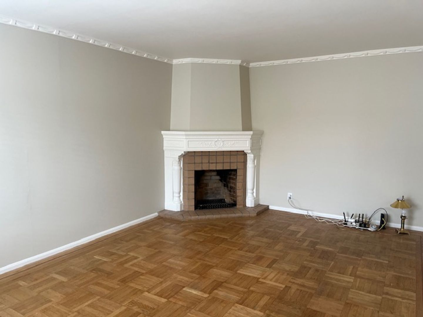 Traditional living room with handsome decorative fireplace.