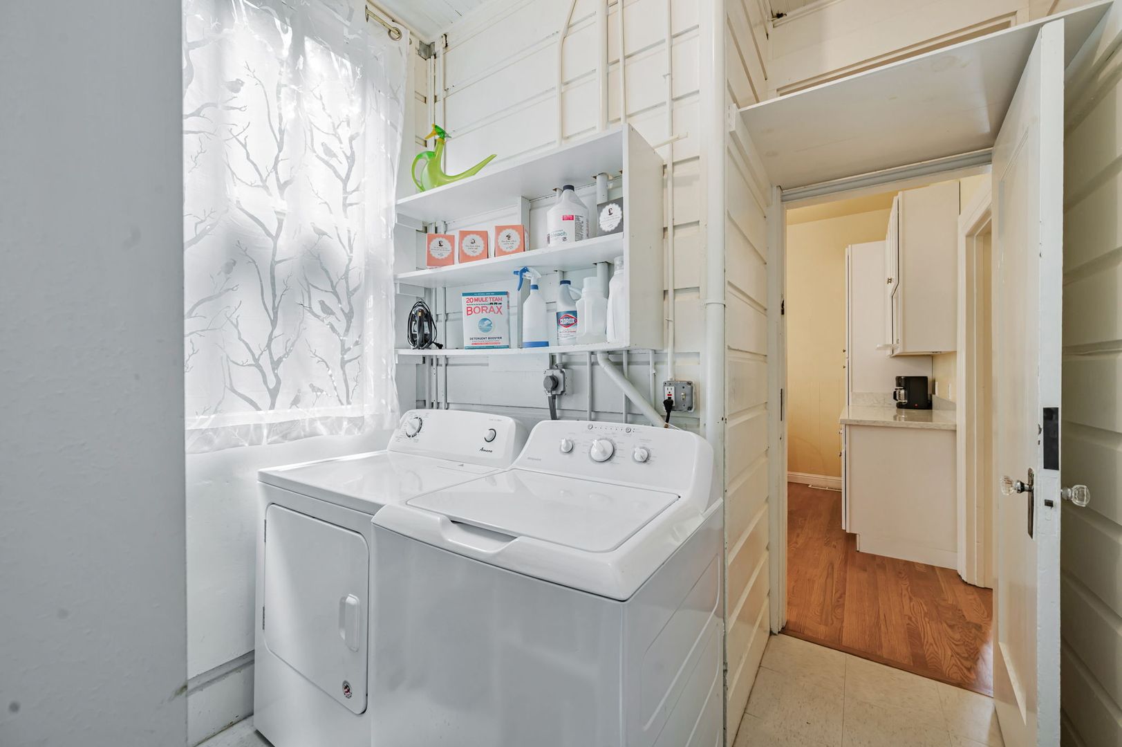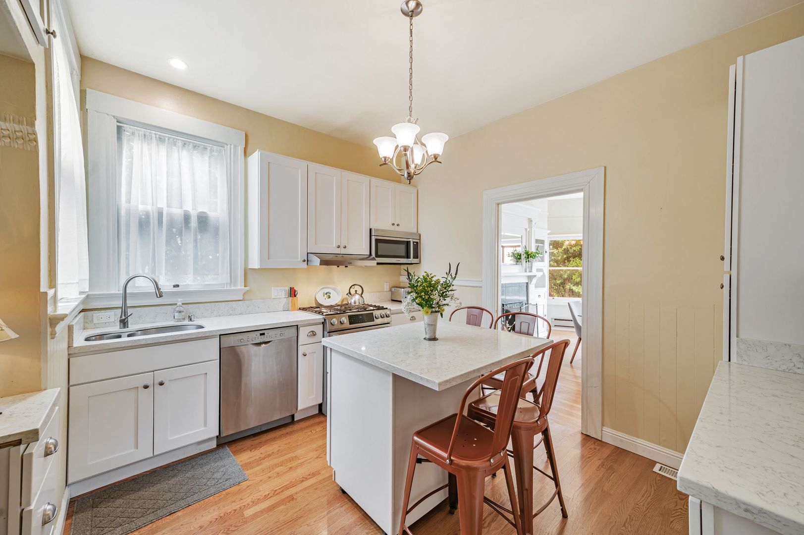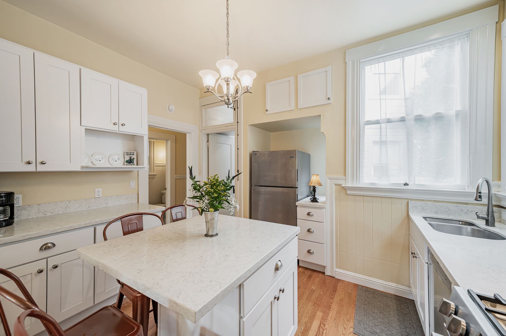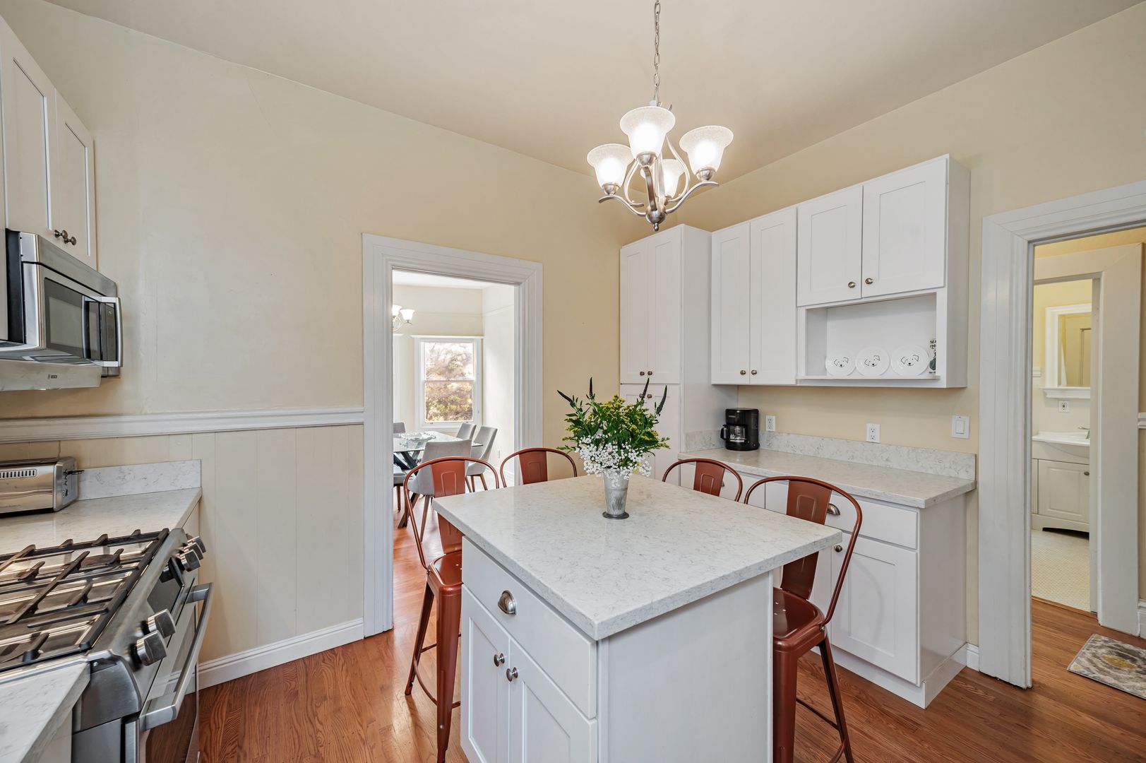 The renovated kitchen, complete with a spacious center island, complements the built-in hutch in the formal dining room. A separate laundry room, equipped with a washer and dryer, adds convenience.