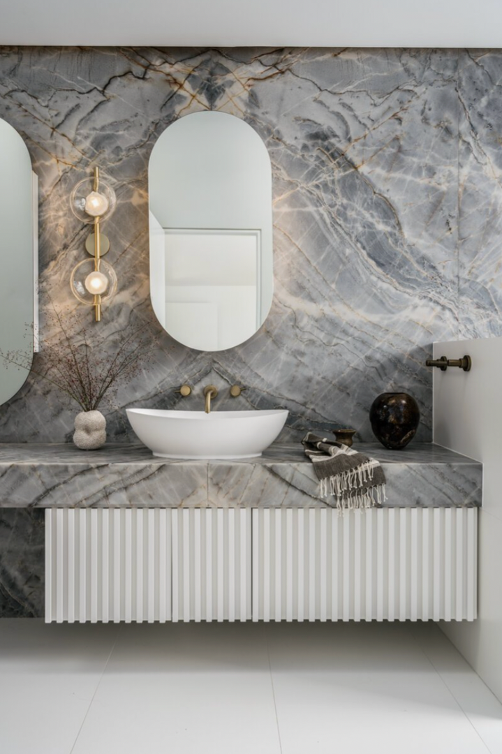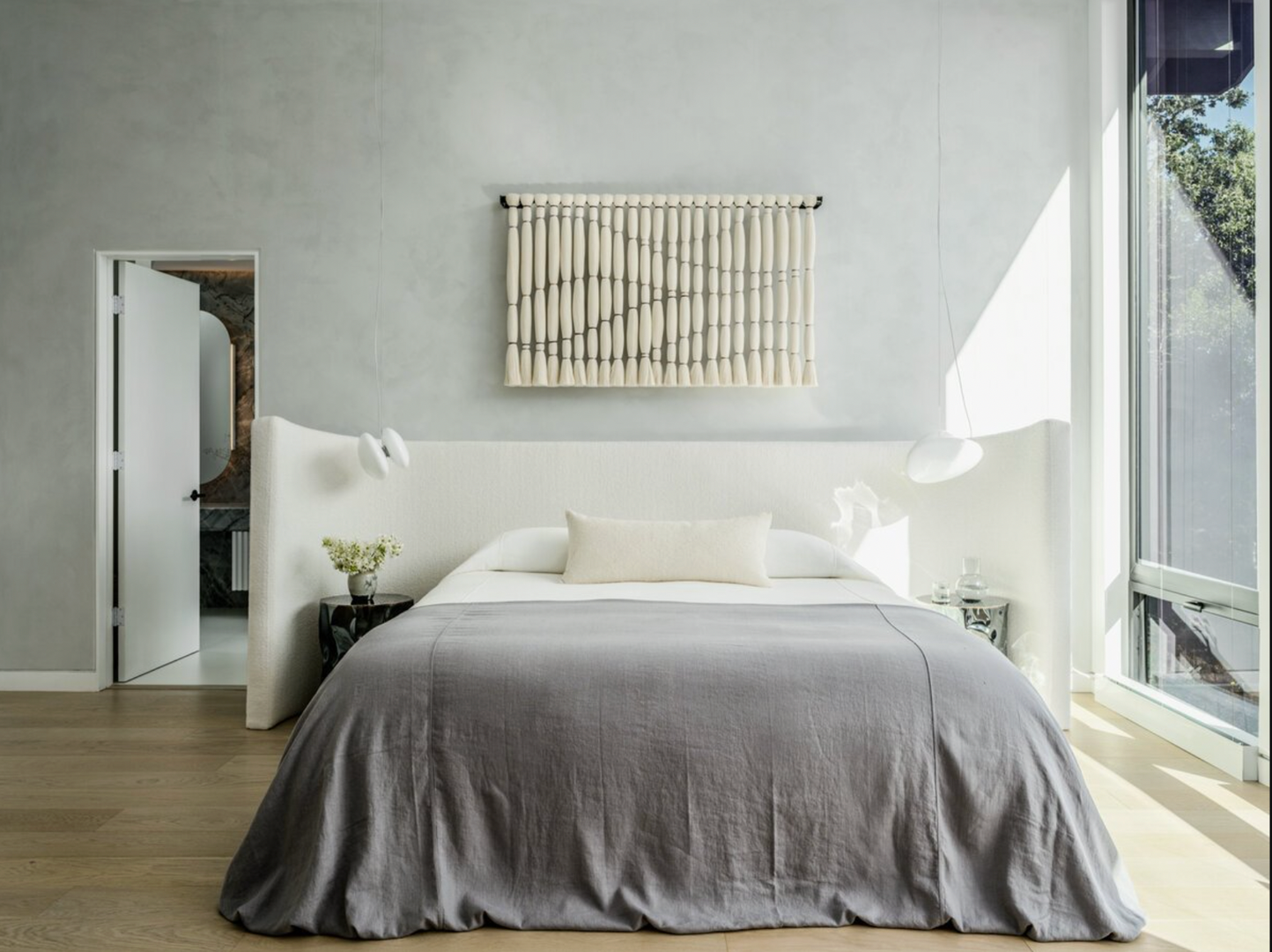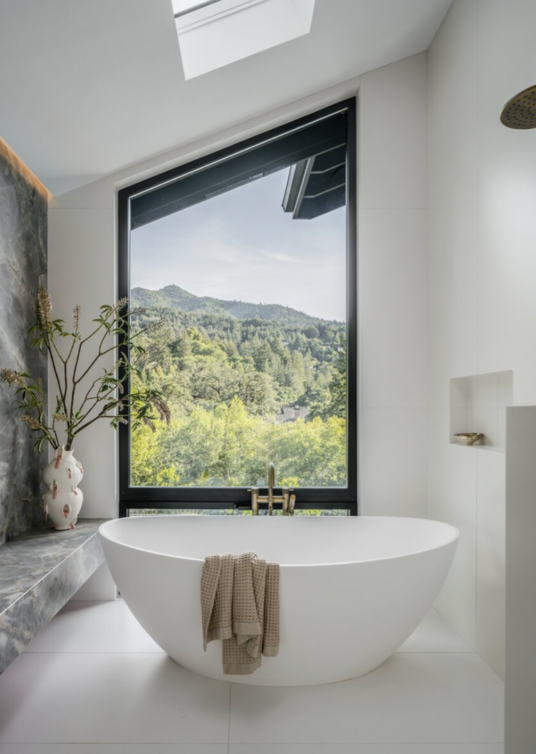 The upper level includes a luxurious primary suite, along with an additional bedroom/office. The primary retreat features oversized windows with Mt. Tam views and a stunning spa-like bathroom with double vanity, soaking tub, and shower.
