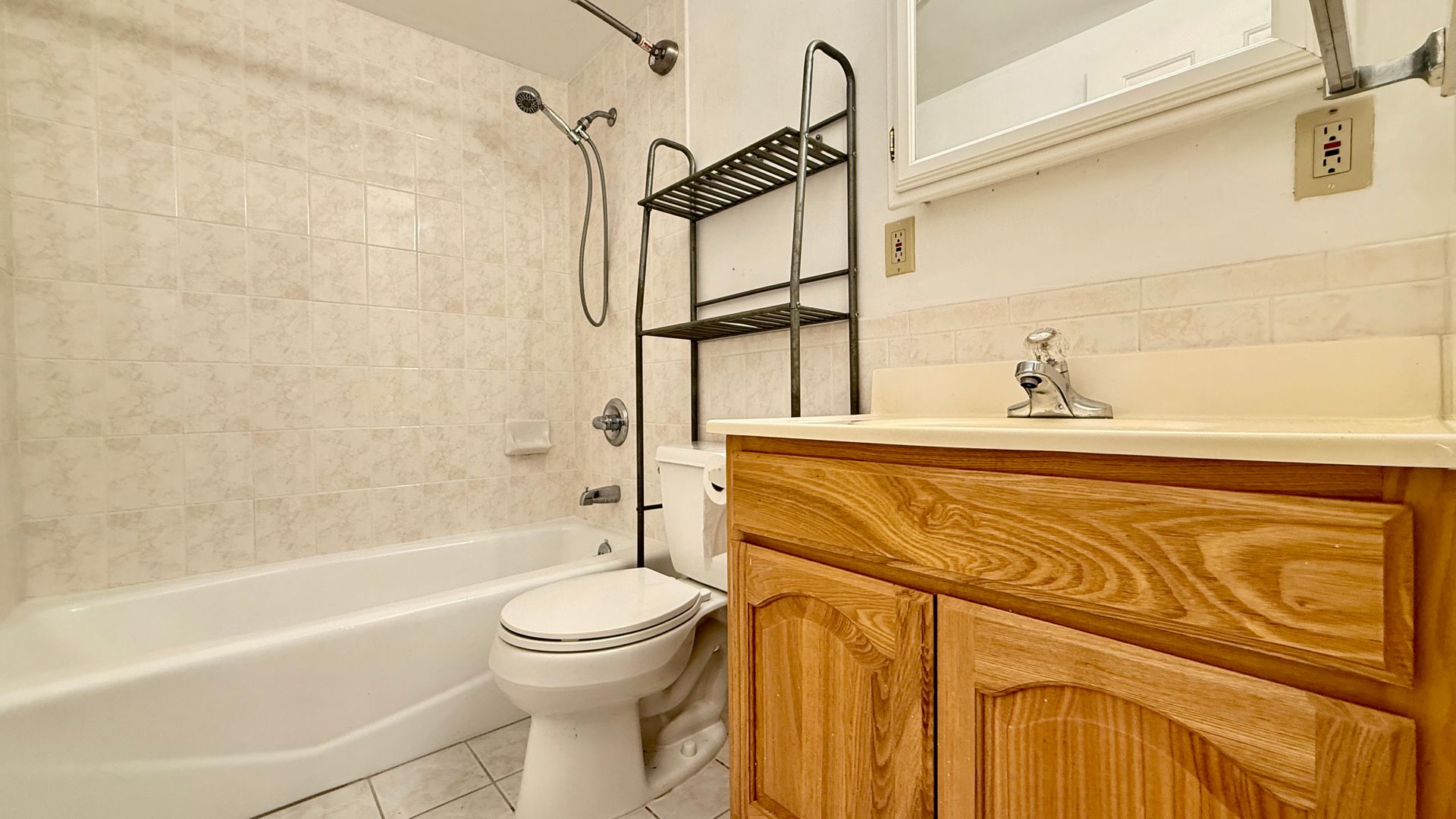 * Eat-in kitchen with tiled floors, subway backsplash, hooded gas range, farmhouse sink, Bosch dishwasher & brand new refrigerator